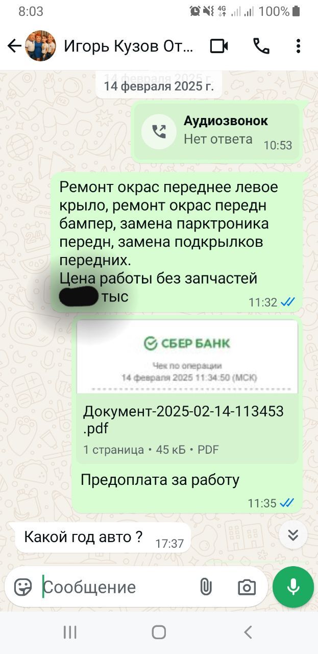 Игорь взял с меня предоплату (15 на ремонт и 7 на подкрылки). Он сам настоял, чтобы я под каждым переводом подробно описал, на что перевожу деньги, чтоб потом не было претензий и недопониманий. Ответственный человек. Сразу видно!