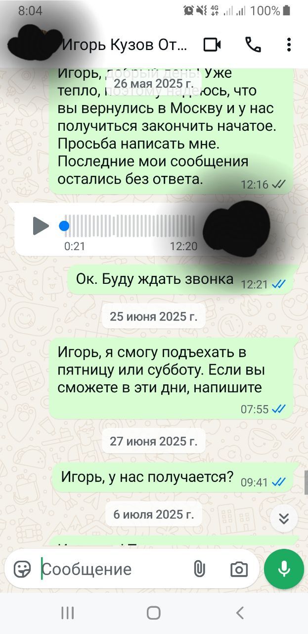 Дальше на скринах, в принципе, все понятно. Даты реальные. Замазал цены (хуй знает, зачем. Поэтому цифры даю в тексте), адрес, ФИО друга и аватарку Игоря (он там всей семьей в виде мультяшных человечков) . Всю переписку не вижу смысла выкладывать. Там одни "завтраки", которыми Игорюня кормил меня.