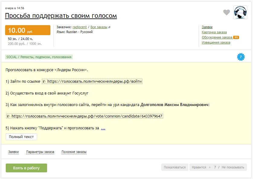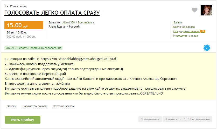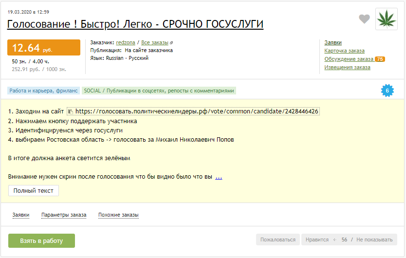 На сайте Advego, где каждый фрилансер может найти себе работу по душе, появились задания политического направления: зайти через сайт госуслуги и проголосовать за кандидата на сайте "Политические Лидеры РФ". Цена 10-20 рублей...