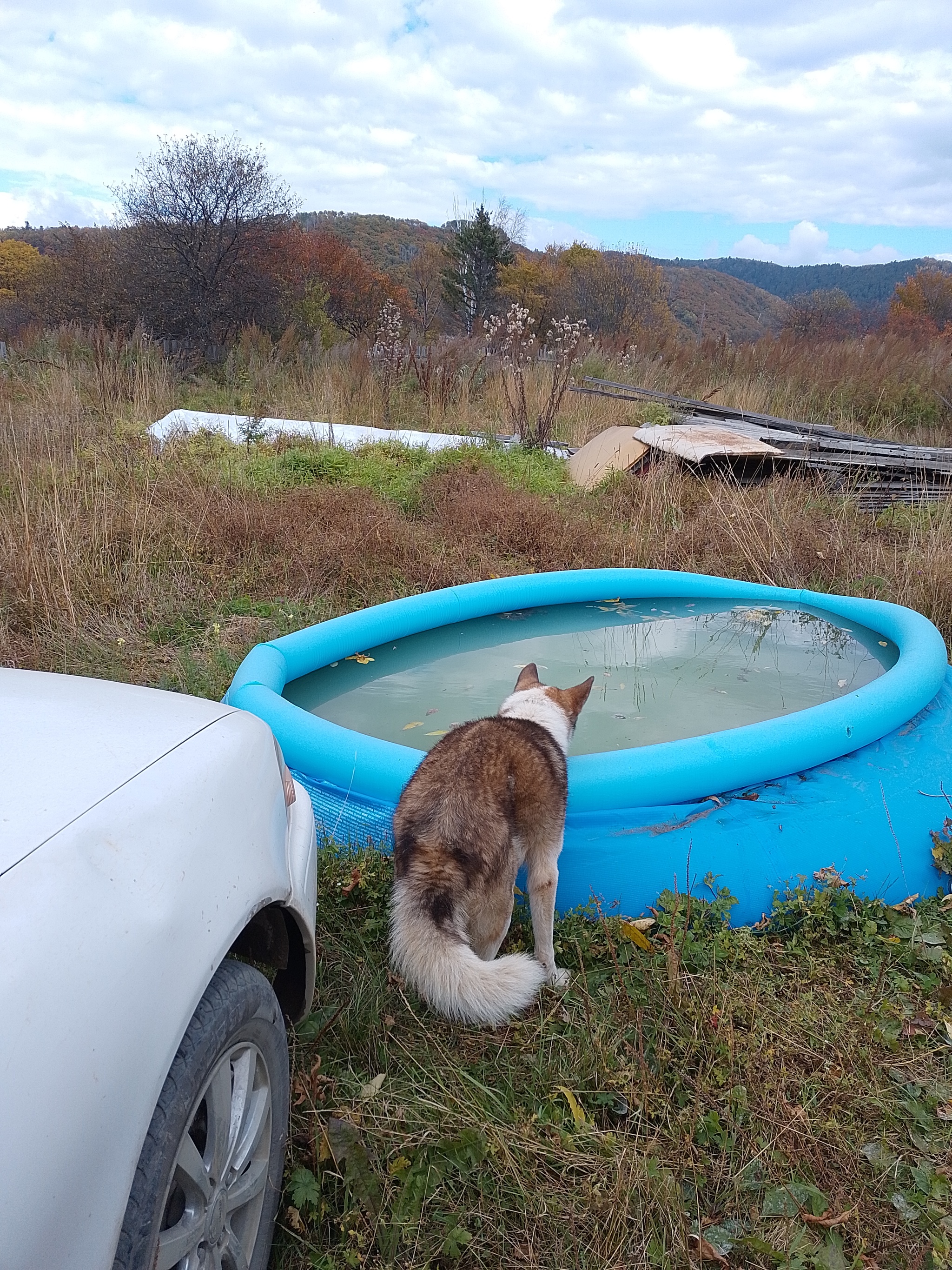 На самом деле он уже год с нами живёт, с сентября 2024 года. Ехали в Рощино со стороны Мельничного. На обочине дороги лежал пёс, красивый, не уходил. Через 4 часа поехали обратно и он все ещё лежал. Вышли посмотреть, жалко стало. Думали может машина сбила или старый и больной. Забрали домой. Он не мог ходить, задании лапы не слушались.