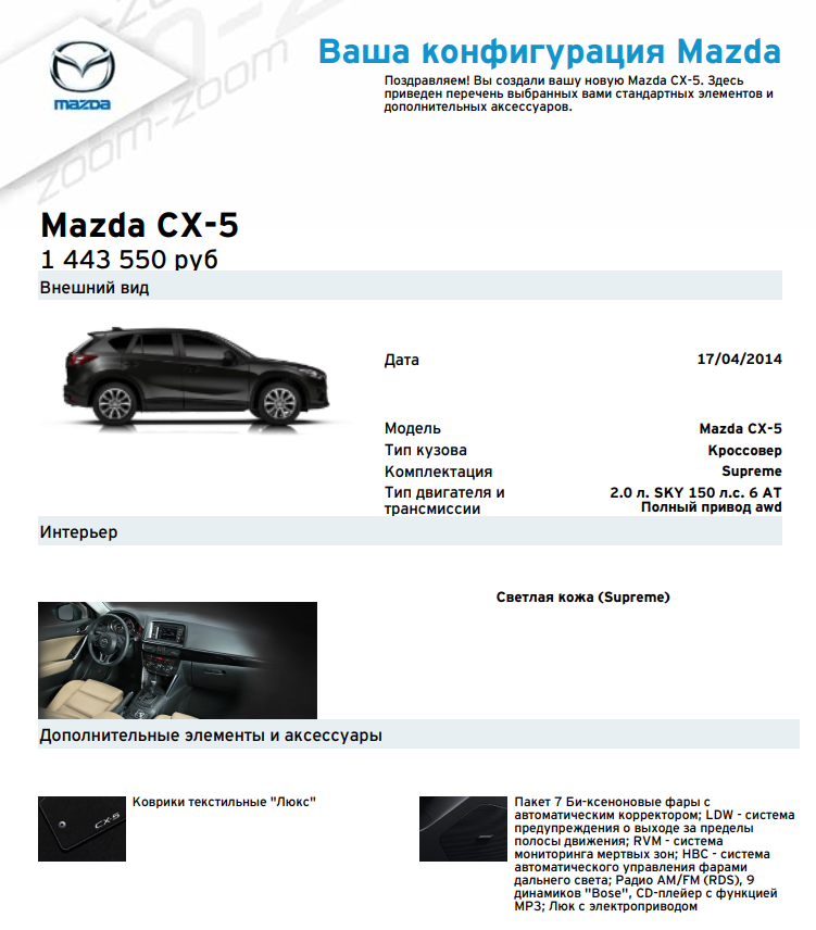 Нашёл тут в архивах пдфку, расчёт тачки, хотел в 14м году купить Мазду. Хорошая комплектация, всё такое.