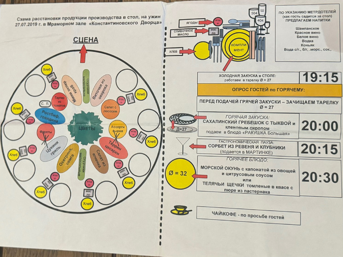 Не буду углубляться в описание масштабной развлекательной программы — я видел её лишь краем глаза. Зато расскажу о том, каково было работать на банкете такого уровня и что входило в меню. В статье речь пойдёт о мероприятии 2019 года. Поводом для написания статьи послужила ностальгия от увиденного в тумбочке меню с того вечера.