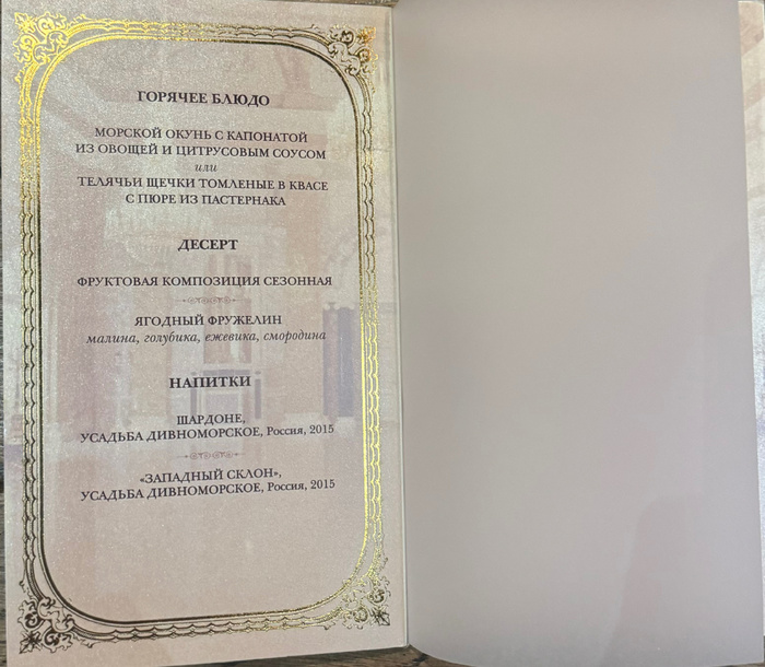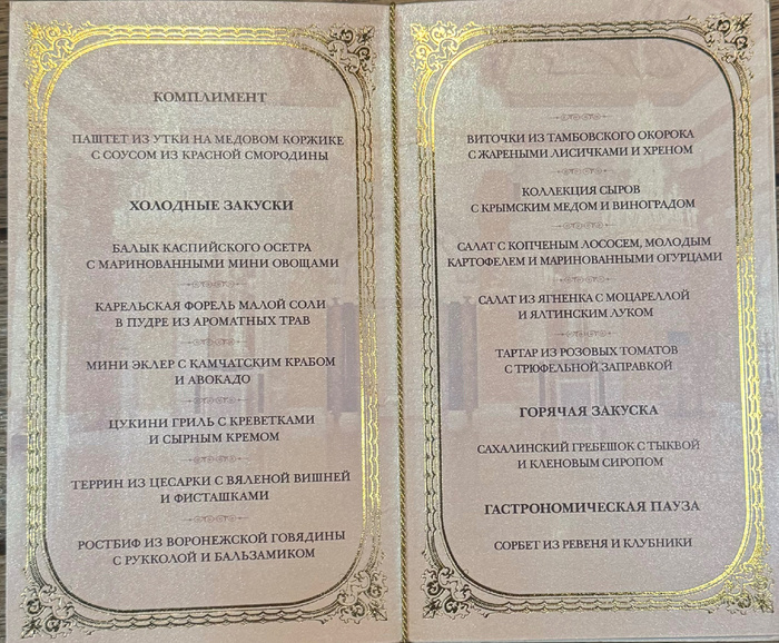Меню для гостей выглядит очень дорого. Организаторы не поскупились на типографию и составили меню по высшему разряду. По-другому на банкете такого уровня быть и не может.