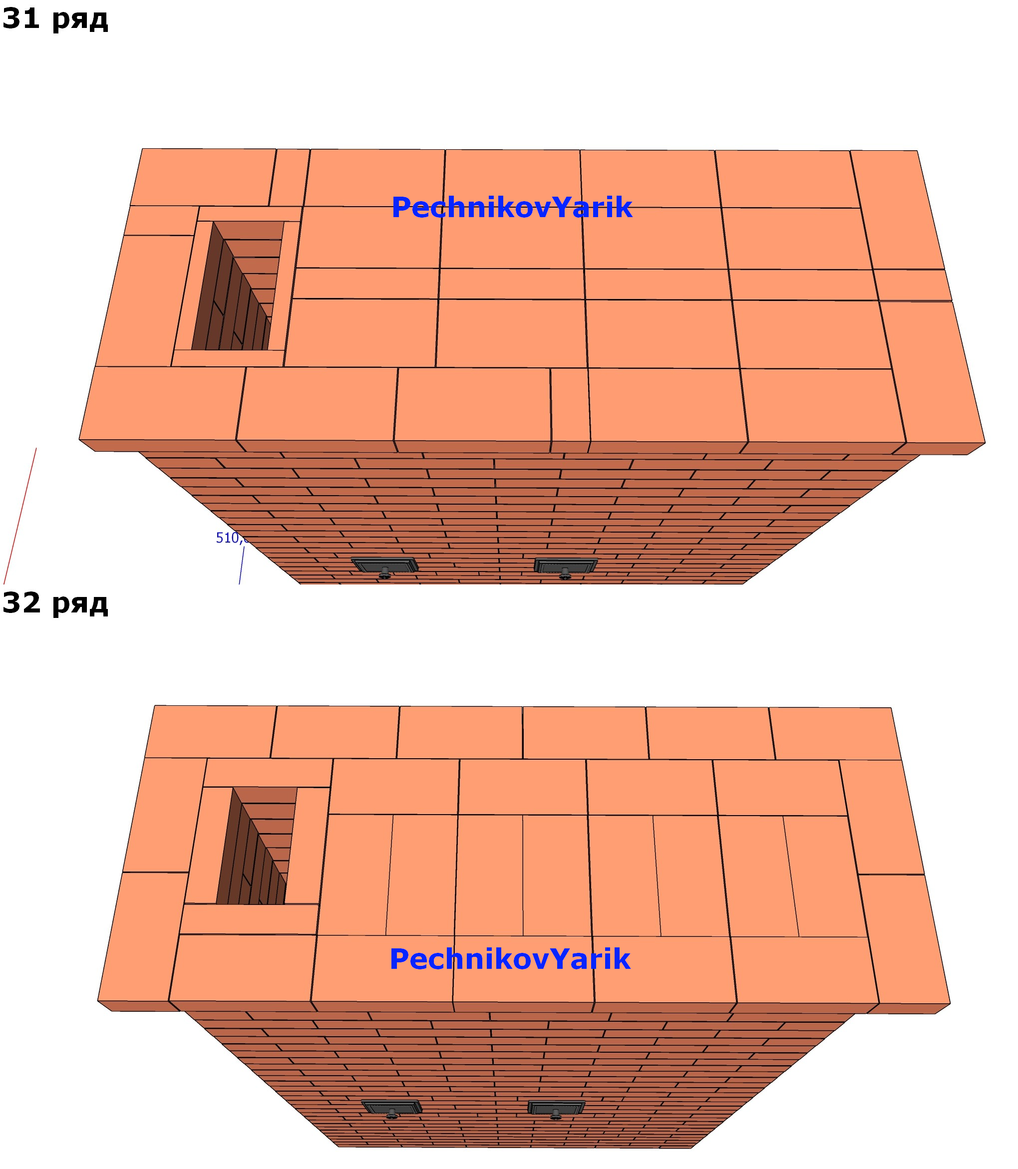 Обычно верх печи делают небольшими выступами по 30 мм. Как сделано в 31 и 32 ряду
