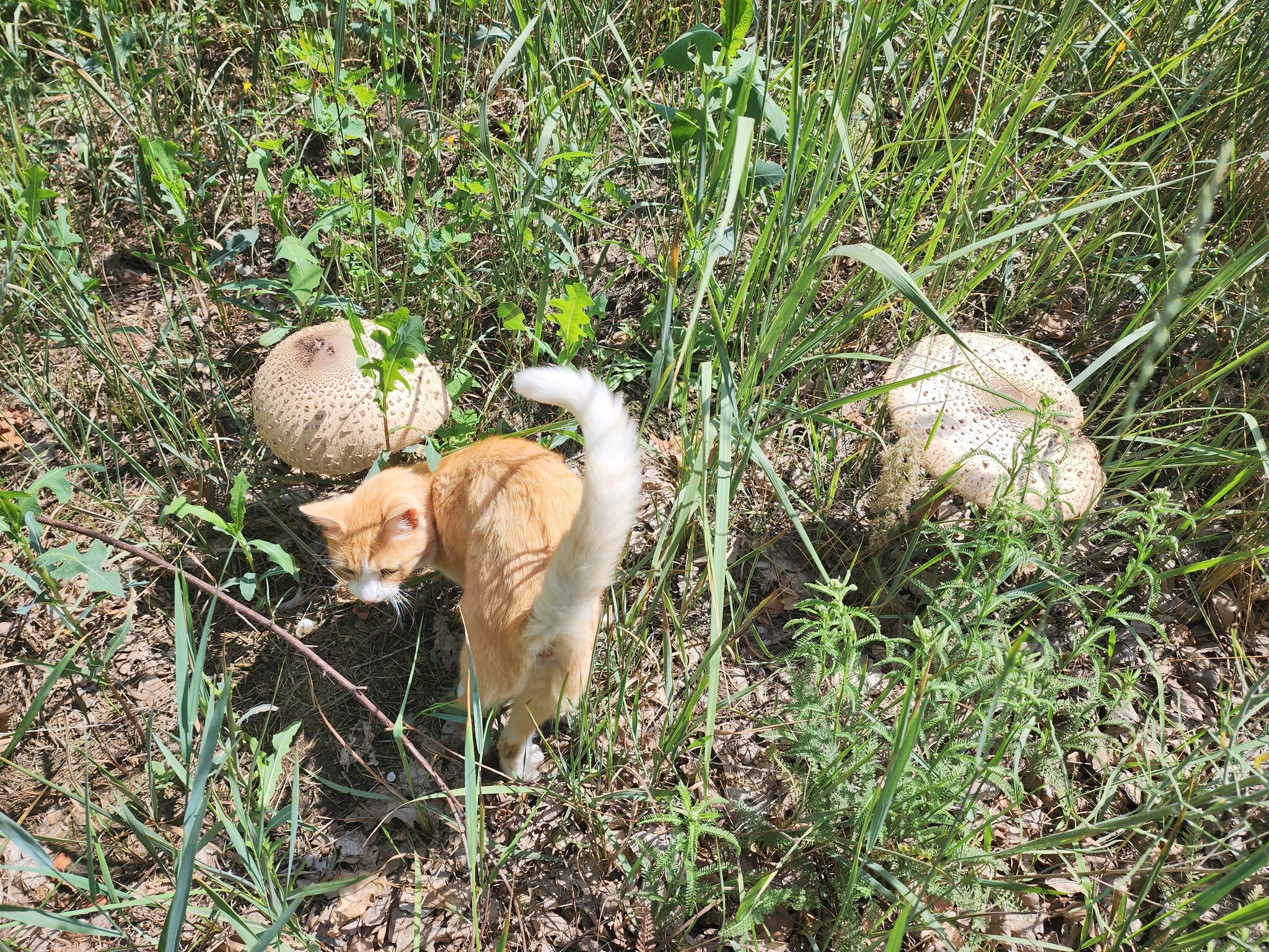 Сегодня шёл на работу и со мной увязался мой кот. Ну вот шли мы с ним и его куда-то понесло в сторону от тропинки, зову его, а он не возвращается, ну я за ним и пошёл. И тут мы с котом встретили эти странные грибы. Я вообще не грибник и ничего в грибах не понимаю, но таких огромных ещё никогда не видел (в моей местности точно). Спецы, подскажите, как они называются?