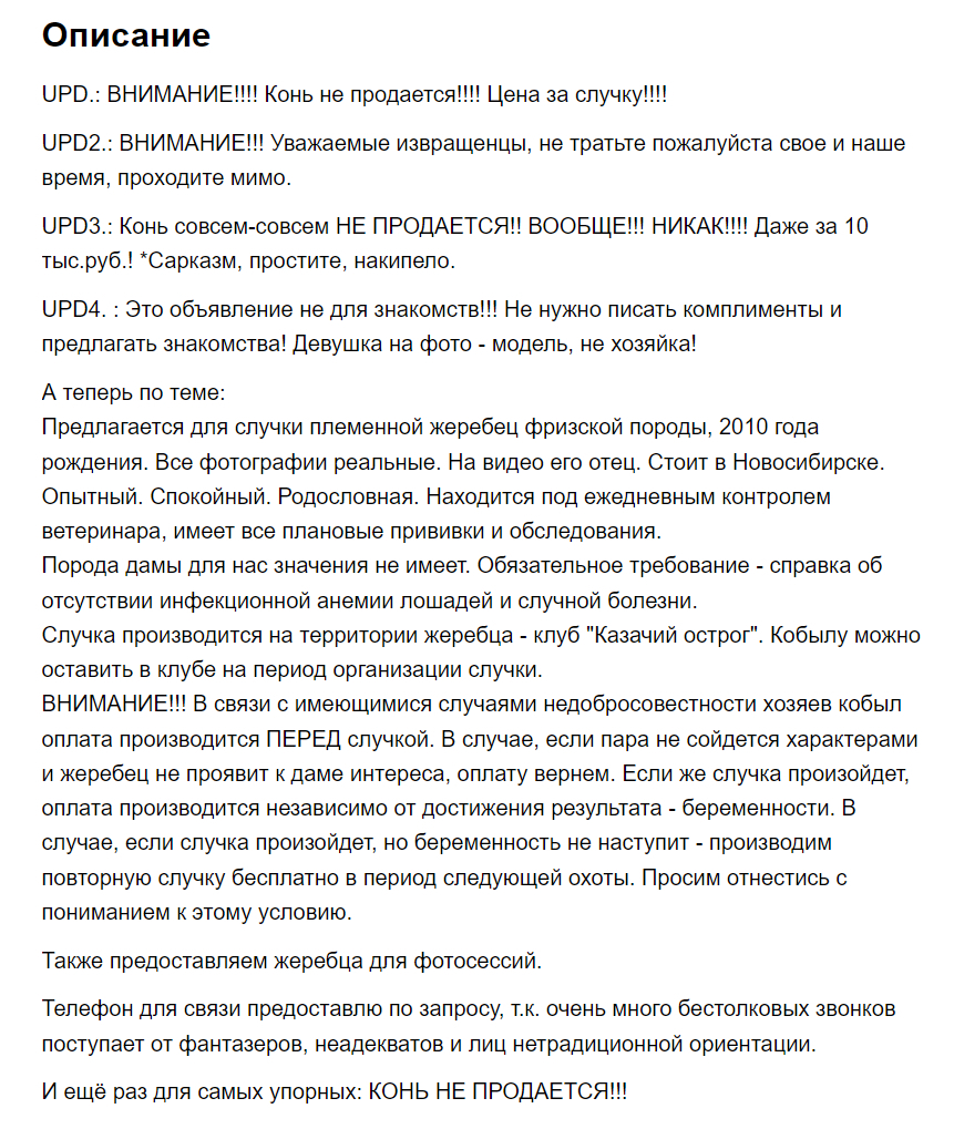У меня тоже есть объявление о вязке собаки, звонят и спрашивают, что не так с собакой, я не понял. Потом выясняется, что она приняла объявление за продажу и пытается выяснить, почему я решил избавиться от взрослого пса))