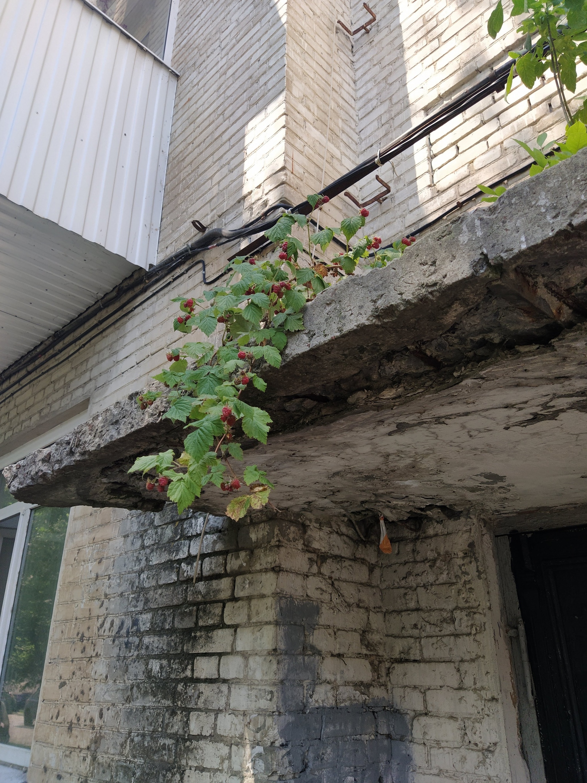 г. Находка, вход в один из подъездов многоквартирного дома, из козырка над входом в подъезд вылез подсолнух. Жизнь всегда найдёт способы начаться. Сори за качество, фотал весером, торопился.