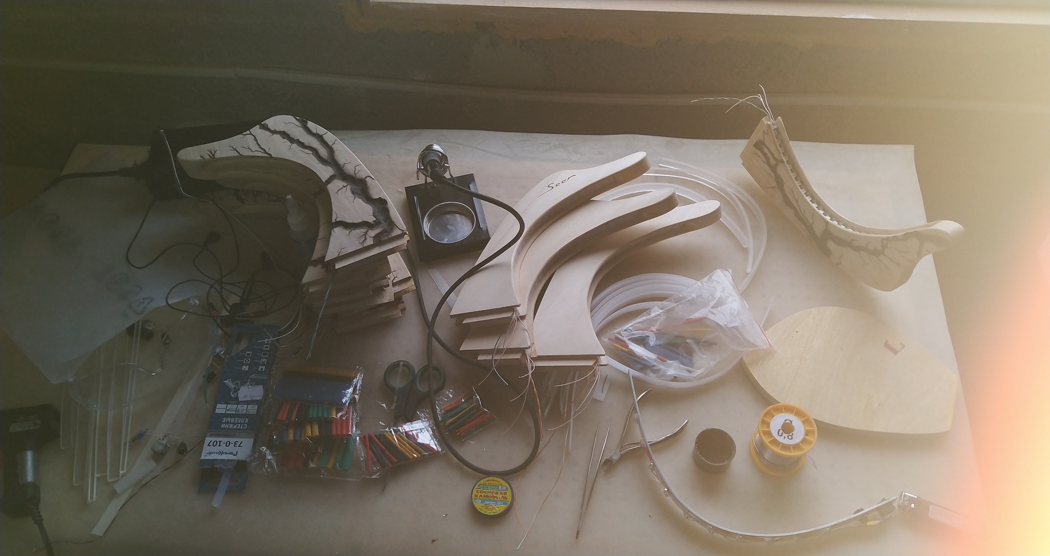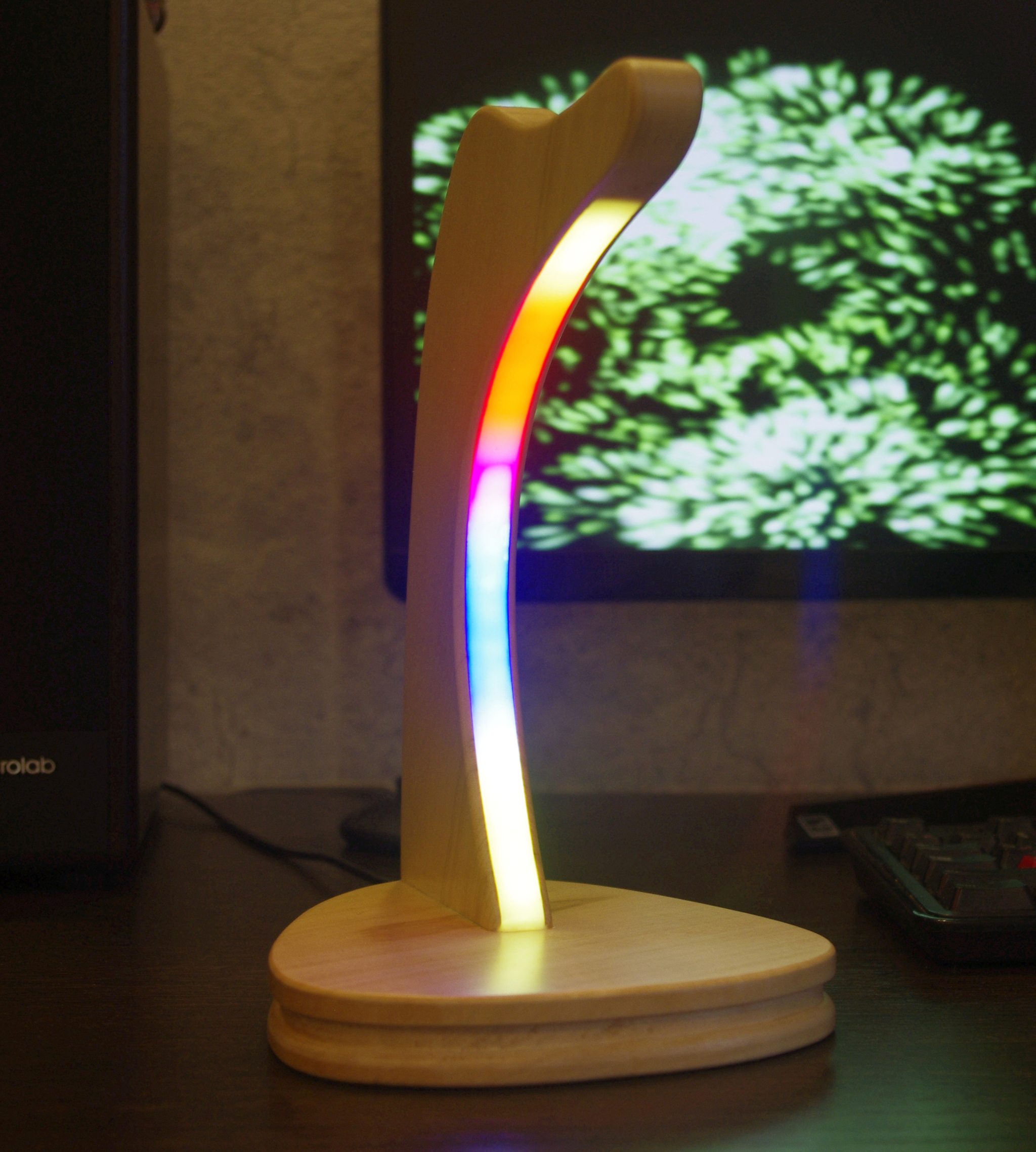 Продолжу. Хотелось сделать подставку универсальной, чтобы она не только держала наушники, но были в ней и дополнительные опции. Добавил гнездо USB под зарядку беспроводных наушников, пока висят на ней. Даже в планах было добавить беспроводную зарядку телефонов, но в экспериментах выяснилось что катушка неплохо так разогревается и всё содержимое моей тайной коробочки будет находиться в некомфортных условиях. Пришлось отбросить эту идею. Даже хотел было встроить в неё аккумулятор, но и эту затею я отбросил, мало-ли что может с ним произойти и никак не хотелось создавать штуку, которая из-за брака или ещё по каким-либо причинам могла полыхнуть. Ведь литий прекрасно горит на воздухе. Добавил независимую подсветку USB гнезда, добавил датчик света, для того чтобы светодиоды в тёмное время не слепили, а в светлое были видно освещение. Тут началось моё экспресс обучение от тестя в столярке. Евгений Самуилович отличный мужик, много чему научил, подсказывал что и как нужно делать и про безопасность давал наставления. Большое ему уважение, здоровья и долгих лет жизни. Смастерил трафареты. Началось изготовление первого тестового образца. За пару сдвоенных выходных всё было готово, дерево распилено, обработано, электроника прошита спаяна и смонтирована. Я был доволен как слон. Устроил фотосессию. И дальше был только один вопрос – нужно ли делать ещё? Ответ не заставил себя долго ждать, наступило время локдауна Covid19, на время которого работа меня послала на удалёнку, пока на месяц. Я же сразу без раздумий махнул в деревню, где всё и закипело. Выпендриваться не стал, взял мягкое дерево, под рукой была липа. Вполне для меня хороший материал, главное лёгкий в работе, но вонючий будто коты нассали)) И к счастью это всё только во время обработки. Модернизировались шаблоны, создавались новые версии приспособ для обработки. Забегая вперёд скажу что много совершил ошибок, на конечный результат не влияющих, но прибавляющих время изготовления заготовок. Постоянно всплывали моменты и понимание того как можно было облегчить производство и его оптимизацию. Меня же время никак не торопило, я получал истинное удовольствия от каждого дня, проведённого с своей идеей. Была весна (календарная) снег ещё лежал. Подъём в семь, брёвна, колун, хотя нет, дровокол служил верой и правдой, поленья, мастерская, буржуйка, спички, юшка, дверь поплотнее чтобы тепло в мастерской не растворялось как сахар в кружке и завтрак. Через часик можно было обойтись без дополнительного утепления луковой моды. И так каждый день. Без выходных с восьми до двадцати двух с перерывом на обед и нужняки. Так хорошо время никогда не проводил. Делал то, что нравиться. Месяц продлился продлением ещё на месяц, чему я был несказанно рад и продолжал творить и создавать. В ход пошли и доски с фигурами Лихтенберга, их то в последствии у меня разобрали в первую очередь. А вот обработка их была немного опаснее, берёза по сравнению с липой очень твёрдая порода, и из-за отсутствия опыта и не отлаженного производства было несколько моментов, где мои пальцы могли стать короче или просто гематомой на животе. Нужно было сделать глубокий паз для ленты и рассеивателя света. После очередного отскока детали от фрезера я просто начал его боятся, вплоть до того что хотел забить на всё(((. Отбитым ладоням и кистям просто давал о