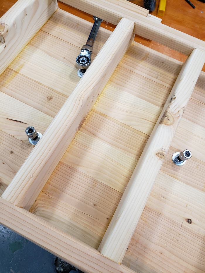 Первое отверстие сделал приемлемо, а потом как-то дрогнула рука и кровь-кишки. Ладно, ок. Делаю 15мм отверстие. Примеряю гайки, снизу буду ставить бутерброд - две гайки и шайба чтобы иметь возможность и убрать люфт резьбы и снизу регулировать высоту. Две гайки доступны легко, особенно накидным ключем с трещеткой, одна чуть геморно но не смертельно.