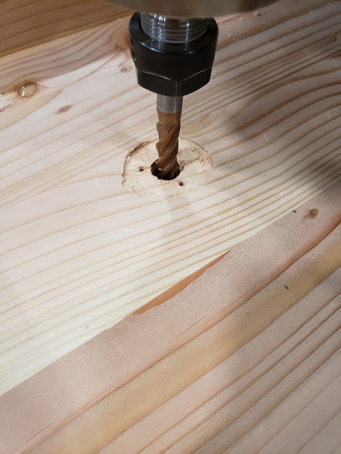 Через офсеты(G54-56) выставляю координаты всех трёх отверстий и не отходя от станка, в прямом смысле, через визард натыкиваю фрезерование круглого отверстия - одного чтобы убрать то что накосячил, другого чтобы таки утопить эти гайки в дерево - ну надо доделать же что начал.