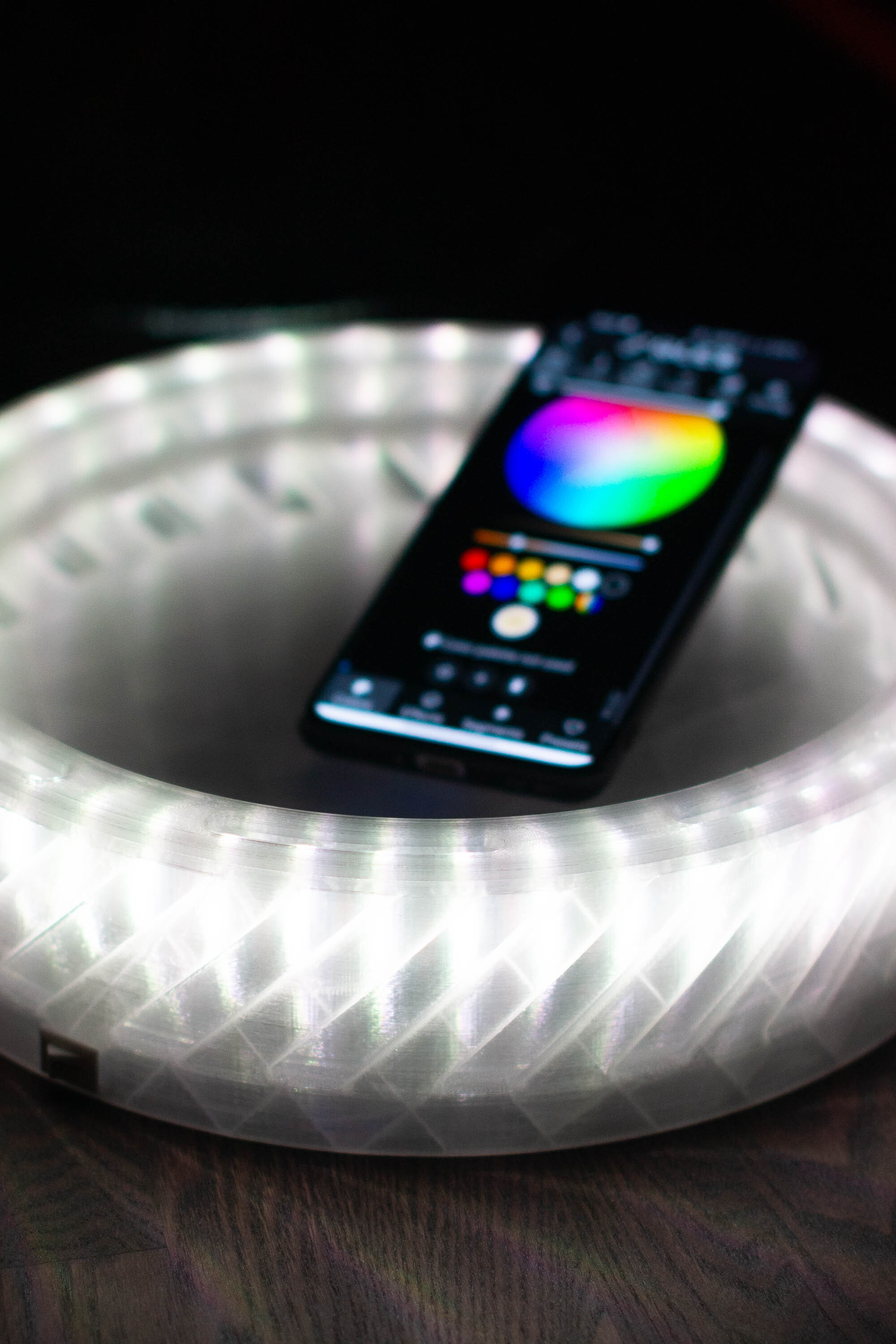 Работает подсветка на 18650 аккумуляторах, до 4х штук и 20 часов в зависимости от выбранного режима анимации и яркости, управляется всё из приложения на телефоне