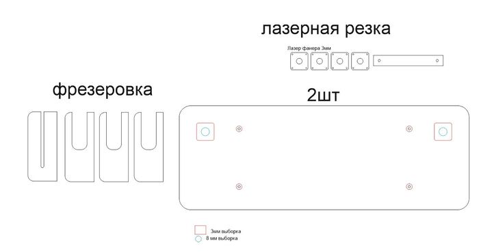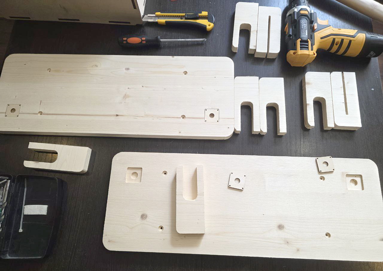 В ход пошла клеёная сосновая доска (остатки материала, что оказались под рукой). Основные детали прошли фрезеровку, для скрытых подвесов использовал немного лазерной резки.