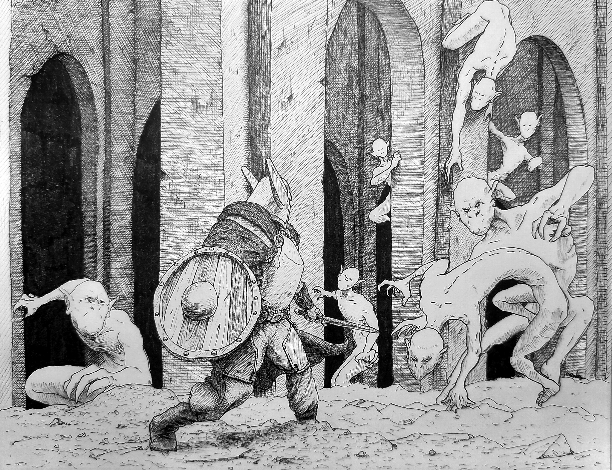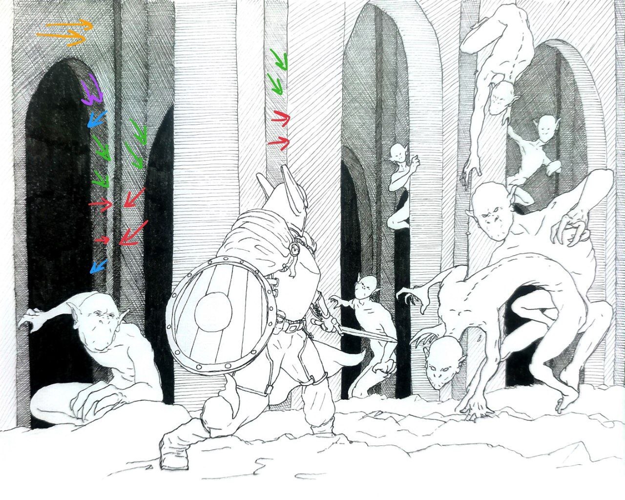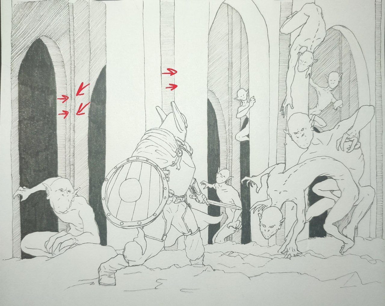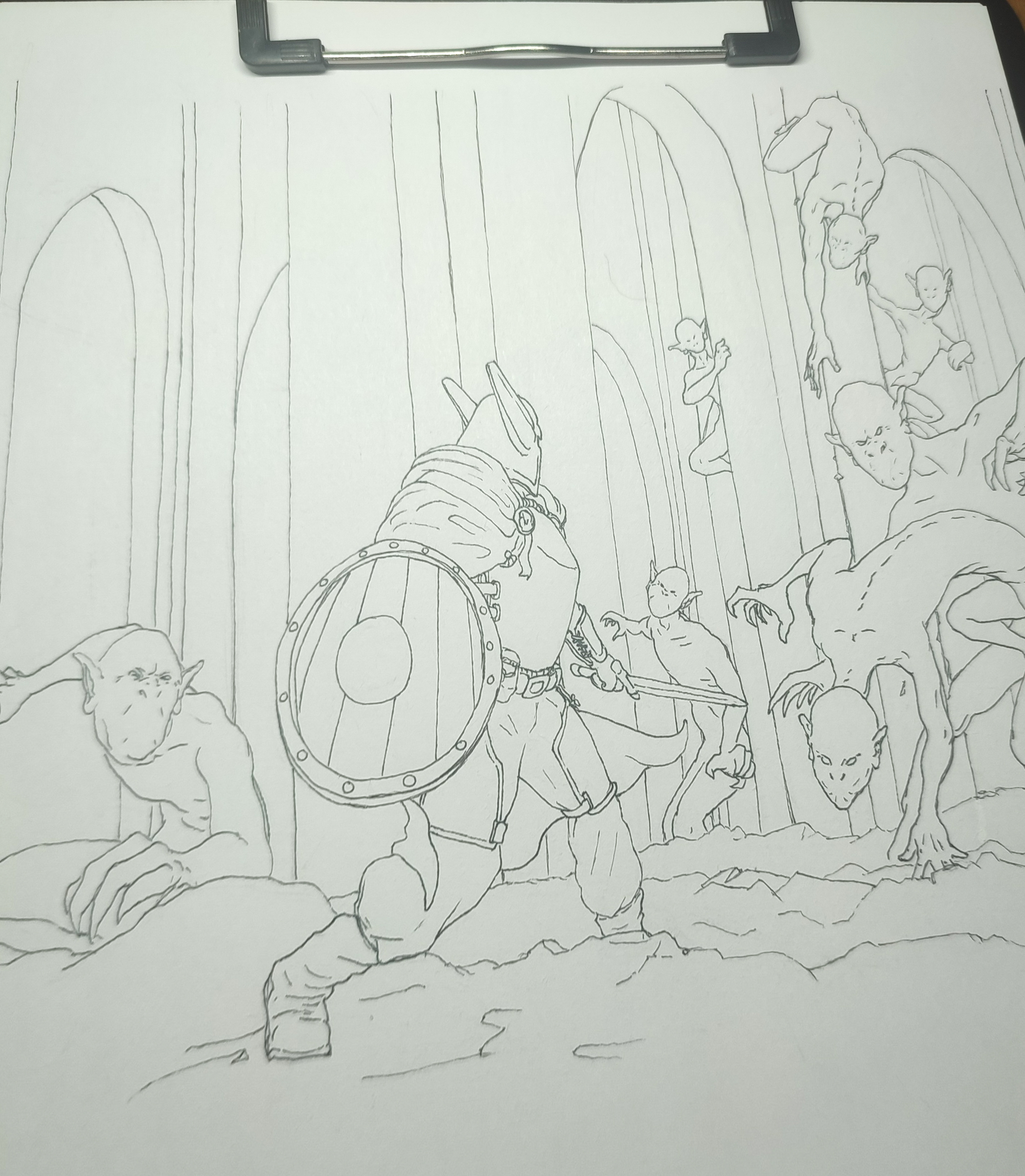 Далее штриховка всего фона. Тут я заранее определил варианты штриховки, которые возможны на рисунке, а также и прикинул как будет располагаться источник света. Не смотря на то, что этот этап саааамый скучный и трудный, я его стал делать раньше, ибо во-первых самое приятное "на потом", что подстёгивает и не позволяет сдаться раньше времени, а во-вторых готовый фон предостерегает нас от ошибок с освещением на тех объектах, которые будут в фокусе внимания.