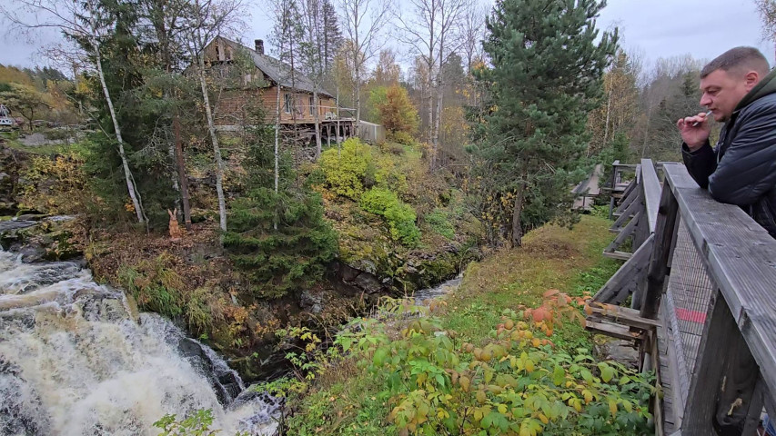 Километрах в 30 от Сортавалы по дороге на Питер (или наоборот, смотря когда будете заскакивать) нас соблазнила вывеска "Водопад Метсямикли". Соблазнила, потому что Мотя - человек клинически больной до воды и водопадов в особенности, так что у рулевого не было шансов. Он, кстати, тоже не пожалел.