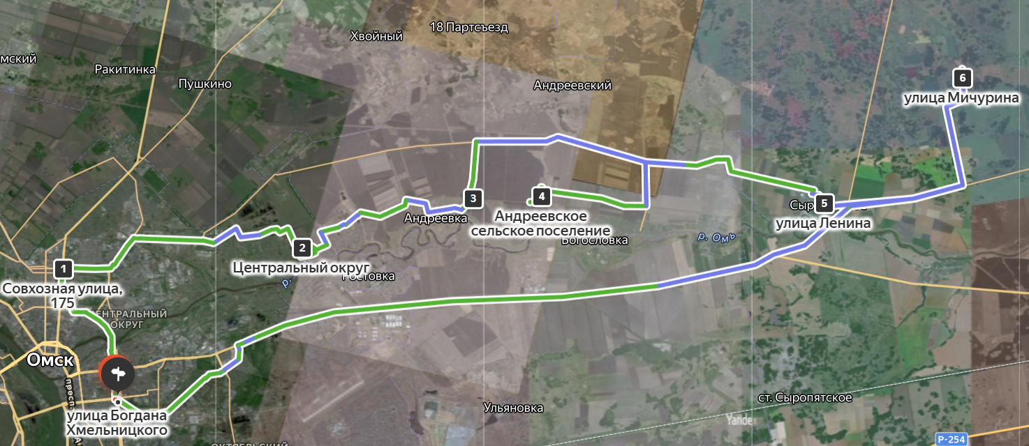 При этом навигатор яндекса немножко пиздит и уговаривает дать круг, хотя между точками 3 и 4 есть отличная, полевая дорога.