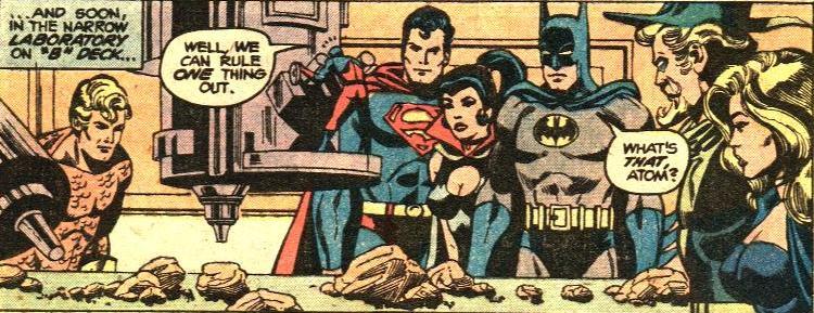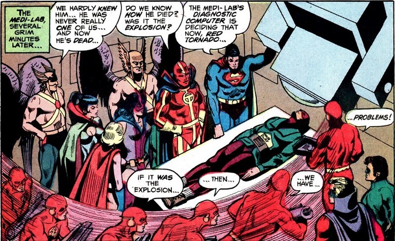 Сегодняшняя подборка начинается с детектива – в комиксе Justice League of America #171 за октябрь 1979 года, от Джерри Конуэя (история) и Дика Диллина (рисунок). Проходит ежегодная традиционная встреча Лиги Справедливости с Земли-1 с Обществом Справедливости с Земли-2 – и на ней один из участников Общества Справедливости, Мистер Террифик (Терри Слоан), давно ушедший в отставку, объявляет о возвращении к жизни супергероя – временном, чисто чтобы поймать и обезвредить недавно вернувшегося врага, Короля Духов (Spirit King). И он подозревает одного из собравшихся супергероев в предательстве…но выдвинуть подозрения и «ткнуть пальцем» не успевает – на спутниковой базе Лиги Справедливости происходит взрыв. Тут уже не до детективов – нужно быстро-быстро заделывать дыру, чтобы не задохнуться в космосе!