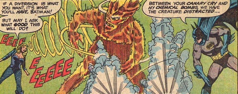И таким образом сегодняшний пост незаметно подходит к концу – в комиксе Justice League of America #180 за июль 1980 года. Лига Справедливости, конечно, сказала, что Файршторм может в любой момент звать героев на помощь – но остальные плащи и маски не ожидали, что он позовёт так скоро. Но герои не сочли это подростковым пранком, отнеслись серьёзно – и отправились Файршторма спасать. Отследив передатчик Файршторма до заброшенного здания, Лига Справедливости сталкивается с одним из охранников Сатиновой Сатаны – огненным демоном. Одолеть раскалённое чудище помогает комбинация химических бомб Бэтмэна, крика Канарейки и магии Затанны.