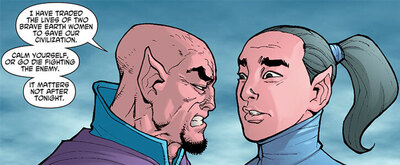 Ну и вот, пока император Сангти любуется отнятыми у Дианы и привезенными ему бронёй и лассо Чудо-Женщины, сама Диана с несколькими приближёнными высаживается на его корабль...и разумеется, Сакритт её предаёт. НабИгают стражники и уводят Чудо-Женщину в камеру, а пленённого Дианой рабовладельца освобождают...но это оказывается уловка! Диана с помощью голограмм всех обманула, и теперь стоит, свободная, в тронном зале, а замаскированная под неё Наташа Тиранова в этот момент отбивается от стражников, и ей на помощь приходит безымянная Даксамитка (которую Чудо-Женщина прозвала Джулией в честь профессора Капателис с Земли). Наташа отрубает генераторы, питающие «ошейники подчинения», и на корабле императора начинается бунт рабов. Диана же под шумок добывает свою броню и лассо – и узнаёт тайну императора Сангти. Изначально раса Сангти состояла ТОЛЬКО из мужчин, но в какой-то момент в ней начали рождаться женщины, и от этой пакости Сангти не могли избавиться ни с помощью геноцида, ни с помощью генетических экспериментов. Женщины продолжали рождаться...и эта зараза зацепила даже королевскую семью. Этот император на самом деле императрица! Чудо-Женщина толкает пламенную речь на тему «Да забейте вы уже на ваши долгие тысячелетия предрассудков и начните уже жить как нормальная двуполая раса!» – и, как ни странно, эта речь работает, и императрица обещает искупить грехи своего народа. Теперь осталось как-то до дома добраться...но это будет уже в другой подборке. Продолжение следует!