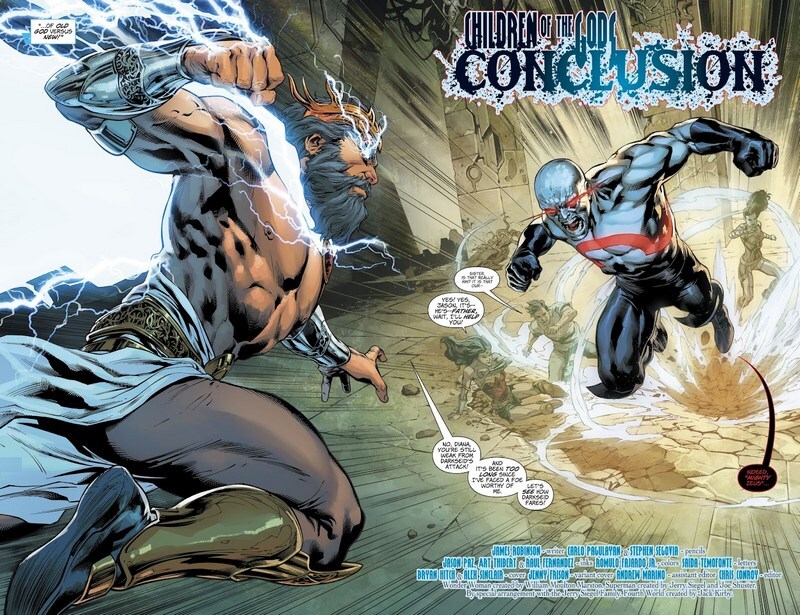 Полыхнув, Джейсон и Грейл собираются уже убить Диану, но их останавливает Дарксайд, шваркнув Чудо-Женщину лучами из глаз. “Я же вам сказал, ей пока нельзя погибать”. А в тюрьме “Бель Рев” Стив Тревор навещает Гиганту. “Мы знаем, что ты в последнее время собирала артефакты. ЧЖ тебя остановила, но нас интересует, зачем ты собирала эти артефакты. Тем более, в составе последнего артефакта была руда с Апоколипса. Тебя кто-то нанял. Нам нужно имя. – Он не представился, но я с одного взгляда поняла, что ему и не нужно”. Сейчас Дарксайд – молодой мужчина. “Лицо попроще сделай, Дарксайд, сейчас я его тебе разнесу. – При прошлом сражении победить меня смогла лишь Лига Справедливости в полном составе. А сейчас ты одна, но тебе даже не страшно. Похвально”. Диана нападает, а Гиганта тем временем раскрывает список артефактов, которые она ещё не похитила, и которые Дарксайду нужны. Ну а Дарксайд начинает вытягивать жизненную силу Чудо-Женщины...а Джейсона начинает жрать без кетчупа совесть. И он прерывает процесс. Так что Диана становится старушкой, но не погибает. Дарксайд во гневе уже хочет и Джейсоном заправиться, но тут появляется “Пуаро”. “Прекратить фигню! Давно почувствовал я ваши стычки, но всё же старался не вмешиваться, ибо поклялся устраниться, чтобы не жаловались смертные опять, что боги ими помыкают. Ты хорошенько промыл мозги моему сыну и убил нескольких других моих детей...а теперь немедленно отпусти мою дочь!”. Да, этот “Пуаро” – Зевс собственной персоной, и он принимает истинный облик!