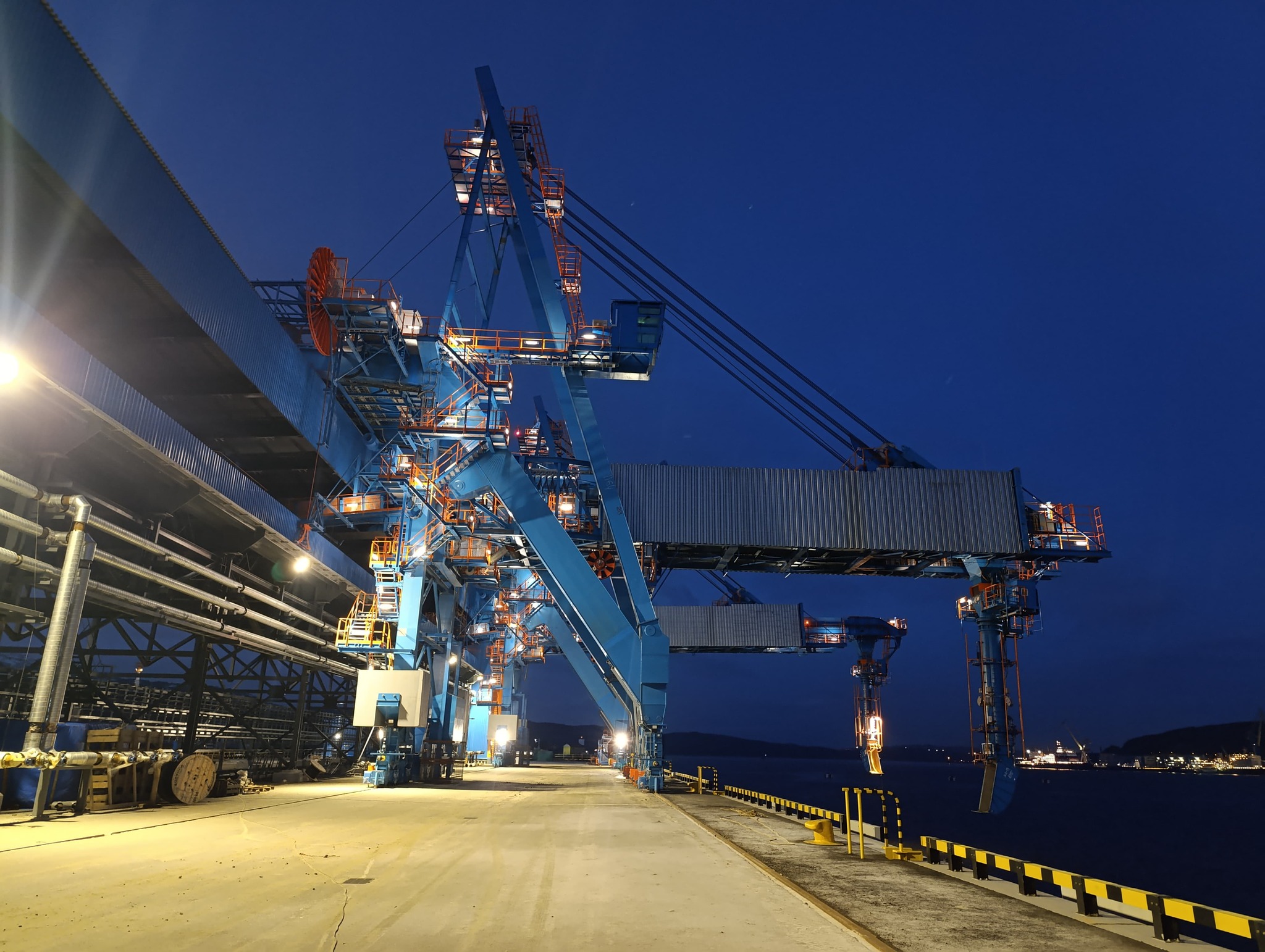 Машины-самосвалы скидывают в эти корыта, откуда судовыми кранами с ковшами сыпят в трюма