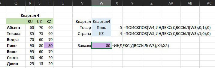 Ну а затем функция ПОИСКПОЗ (MATCH) ищет в этом диапазоне требуемый товар (Пиво) и возвращает его позицию (4 строка, т.к. пустая Q3 тоже считается).