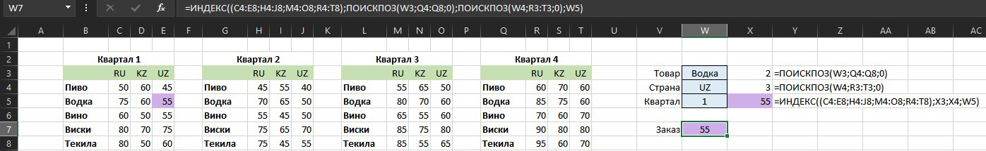 Сперва нужно найти два вспомогательных параметра: номер строки с требуемым товаром и номер столбца со страной. Для этого можно применить две функции ПОИСКПОЗ, используя в качестве основы для поиска любую из наших таблиц, например четвертую: