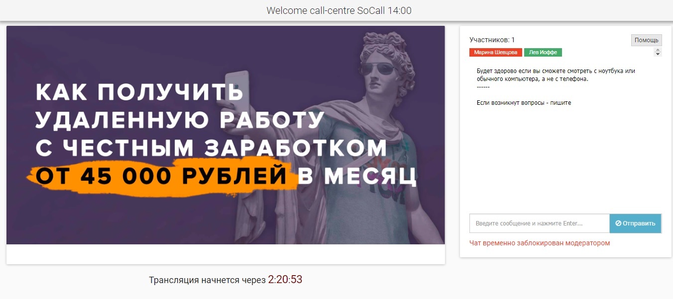 Девушка Марина начала весело и задорно рассказывать про то, что такое удаленная работа и какая она бывает. Кстати, общение велось посредством чата, так что это был скорее стрим чем вебинар. То и дело она читала чат и комментировала те или иные сообщения, реагируя на написанное. Моё имя почему-то не назвала ни разу, но я пока не обращал на это внимания, так как понимал что все сообщения прочитать она не успеет, да и не было такой цели. Говорила она минут двадцать, после чего выскочила ссылка на запись на другой вебинар, посвященный именно работе в колл-центре, которая меня и интересовала, я записался на него и стал слушать дальше.