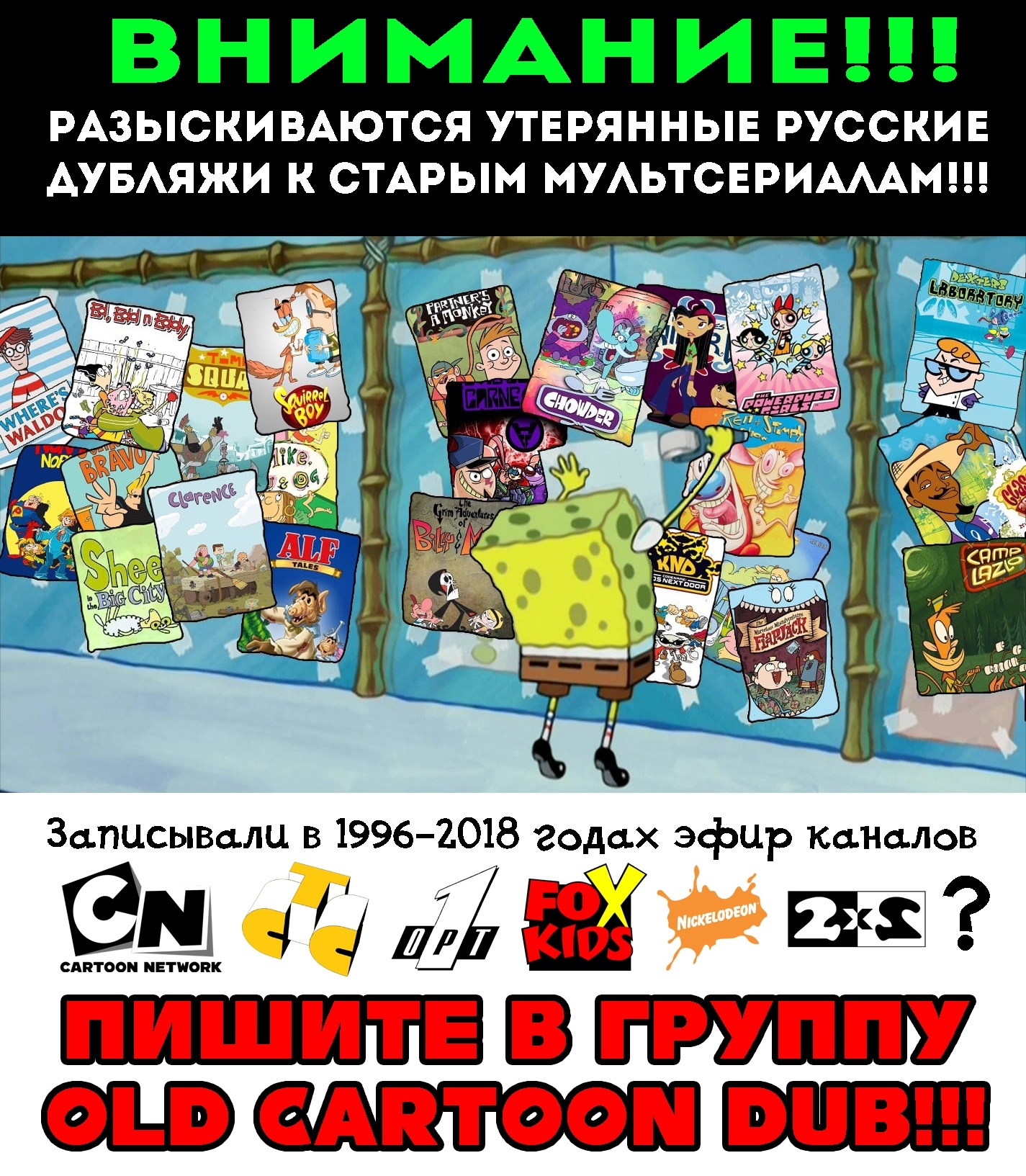 Хочу создать сообщество "Old Cartoon Dub - поиски утраченных дубляжей" с целью вести поиски безвозвратно утраченных русскоязычных аудиодорожек к старым мультсериалам и сопутствующим им телешоу, которые раннее транслировались на таких телеканалах, как "Cartoon Network", "Nickelodeon", "2x2", "СТС", "ТВ-3", "ТВ-6", "FOX kids", "ОРТ" и т.д.