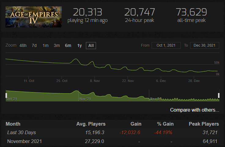 Если частично утрата интереса связана с тем, что сама игра понемногу начинает стагнировать, то еще один фактор – это релиз Age of Empires IV. Новая RTS от Microsoft, World's Edge и Relic вышла в начале ноября и поначалу сумела вызвать к себе большое внимание со стороны поклонников стратегий в реальном времени. Несколько недель подряд AoE IV просто в нули уделывала Starcraft 2 по количеству зрителей на стримах (в стандартный день, без всяких турниров), но сейчас разрыв, кажется, уже не такой большой, а иногда SC2 и вовсе вырывается вперед.