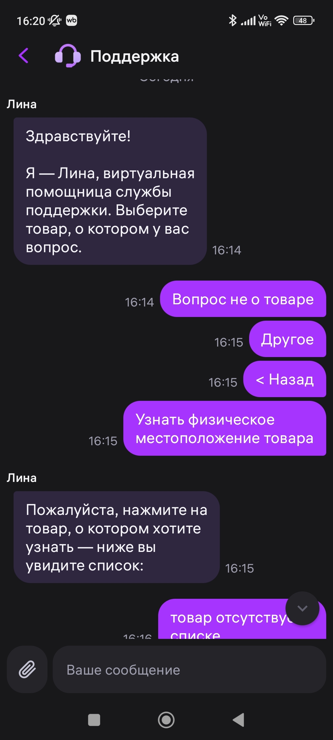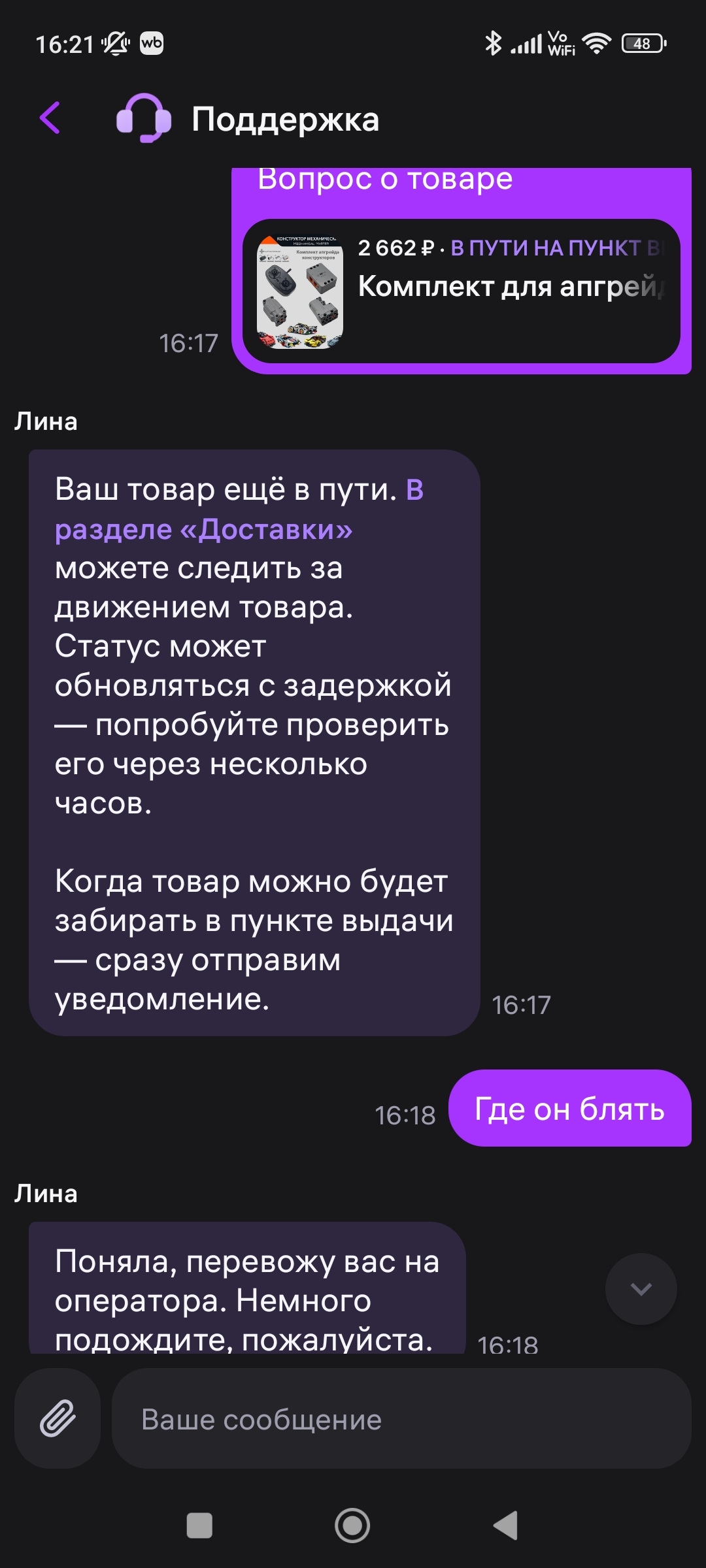Да, я перешёл на личности, но она меня достала. Потом я решил зайти в доставки, нажать на мой товар и там была кнопка, узнать о доставке. Я ее нажал и вуаля, мне Лина сказала туже информацию, которую я знал. И тут меня порвало и сорвался.