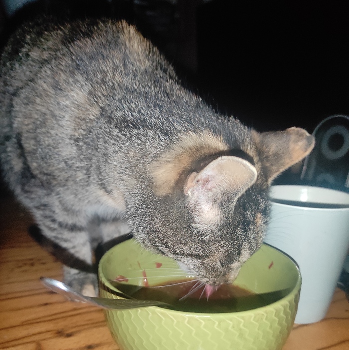 Сижу я,значит,ночью за компом, борщ лопаю (не уверена,что это законно, но вкусно). Внезапно отключили электричество. Пока я соображала куда заныкала свечи, Дульсинея решила поесть борща. Действительно, чего добру пропадать. Корма из миски никуда не денутся, а тут борщ без присмотра.