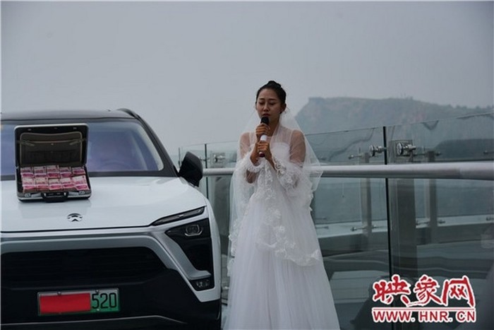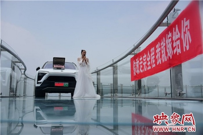 Девушка в свадебном платье загнала на стеклянный мост новый внедорожник, поставила на капот набитый деньгами чемодан (14 500 долларов) и предложила парню себя и приданое, если он преодолеет свой страх — пройдет по мосту. Бойфренд, которого ненавязчиво к месту предложения привели друзья, к такому повороту оказался не готов. Правда, он попытался побороть свою фобию, но в итоге плюнул и ушел, назвав свою невесту безответственной.