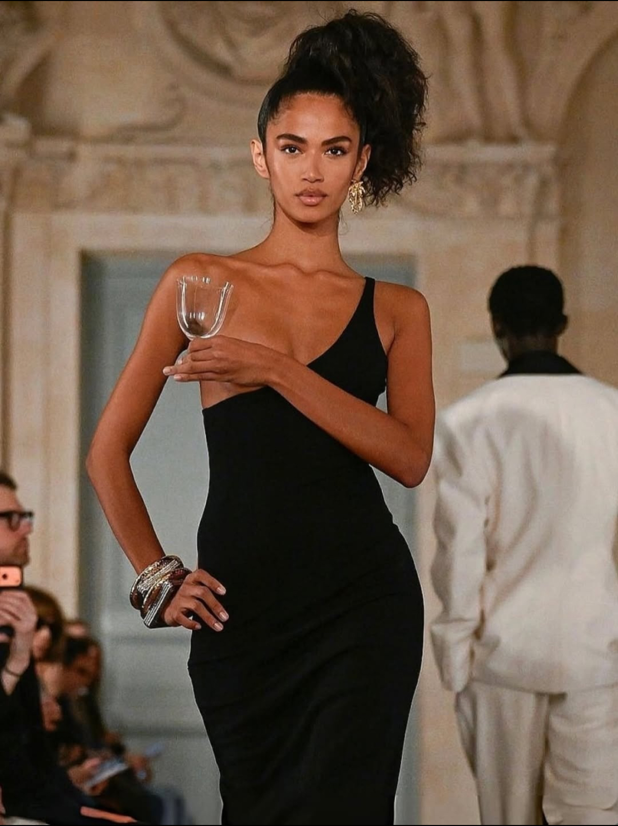 Сам финал показа получился особенно сильным. Модель вышла в платье на одно плечо, частично обнажённая грудь, которую она прикрывает рукой с бокалом. Жест тонкий, не про провокацию, а скорее про уверенность. Всё выглядит естественно, но при этом очень продуманно.