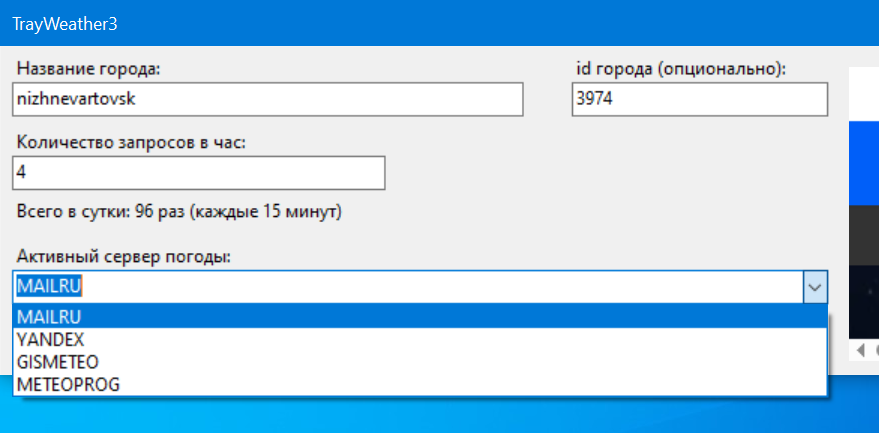 - Четвертое поле - это раскрывающийся список для выбора текущего сервера погоды.