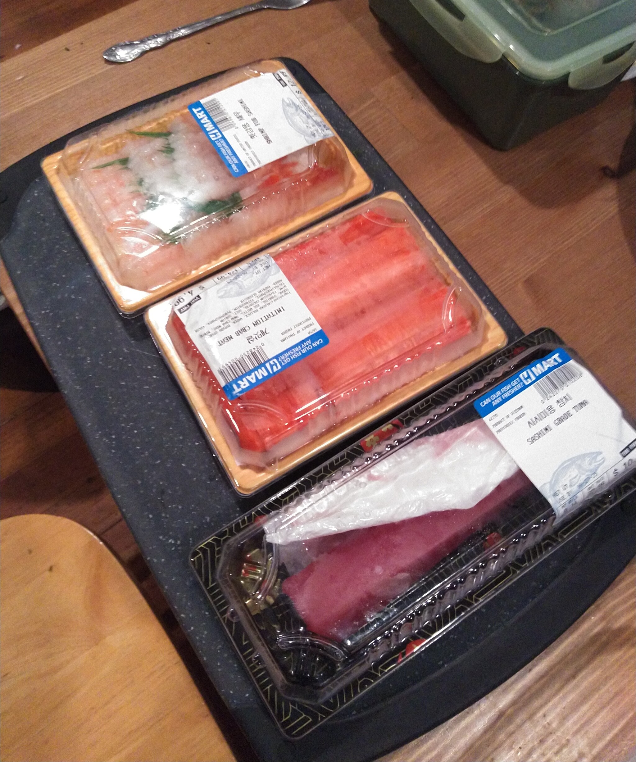 Сначала рыба. Я использовал три разных вида: тунец, креветки и краб.