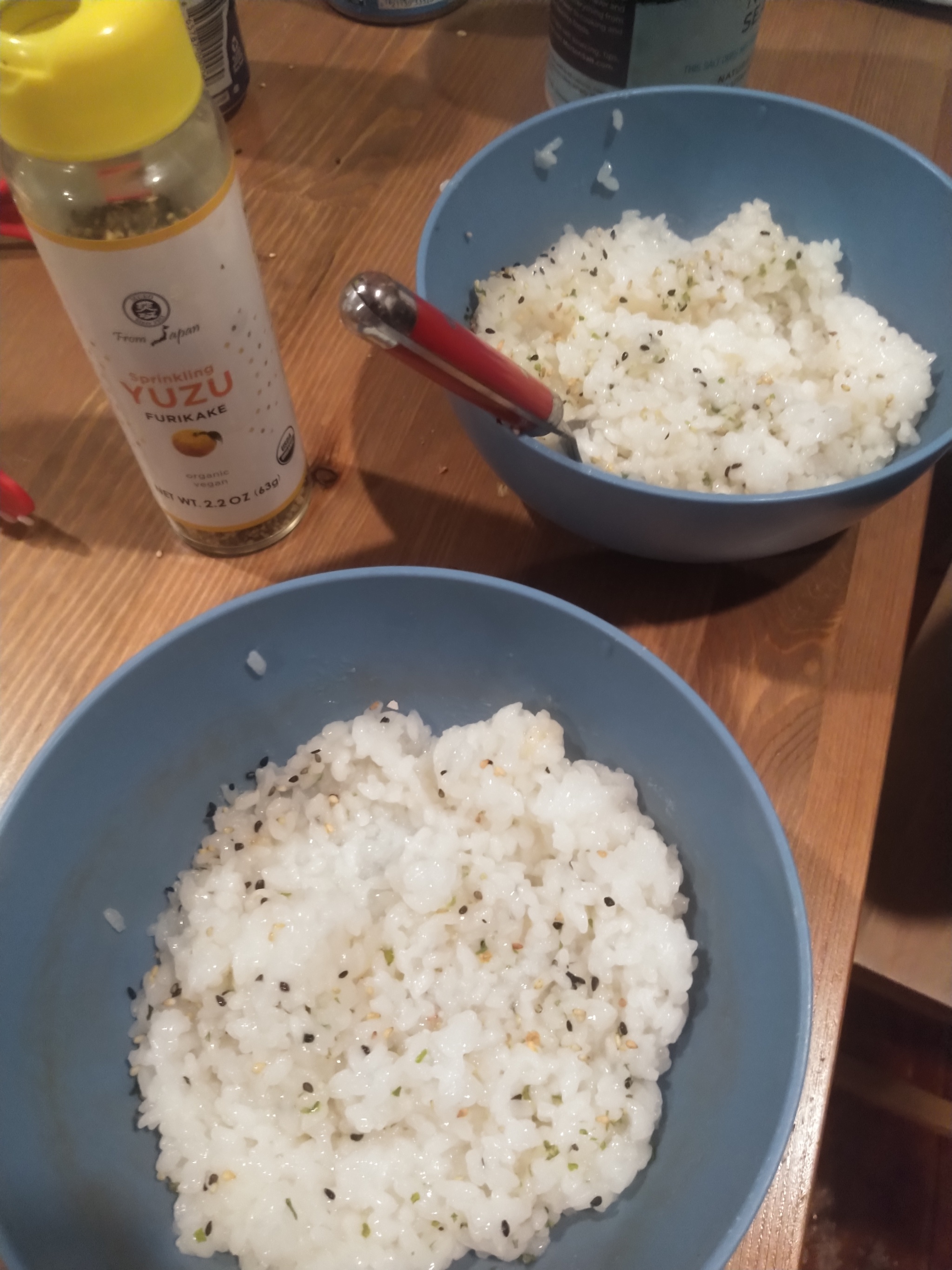 Основной ингредиент обычно рис. Хотя это может быть киноа или какая-то другая крупа или просто салат. Я просто использовал обычный рис для суши, приготовил его как обычно, добавил немного уксуса и пару пакетиков сахара. У меня обычно нет сахара в кладовке, я просто краду его из Starbucks по дороге домой с работы)