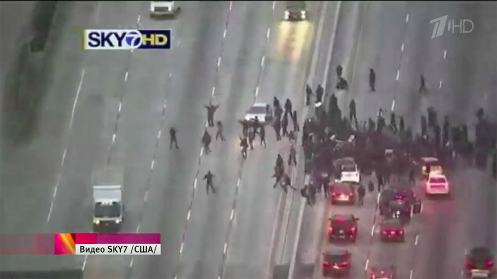 На приведенных в сюжете «Первого канала» кадрах зафиксирован стихийный митинг против жестокости полиции, который прошел 7 июля в Окленде, штат Калифорния.