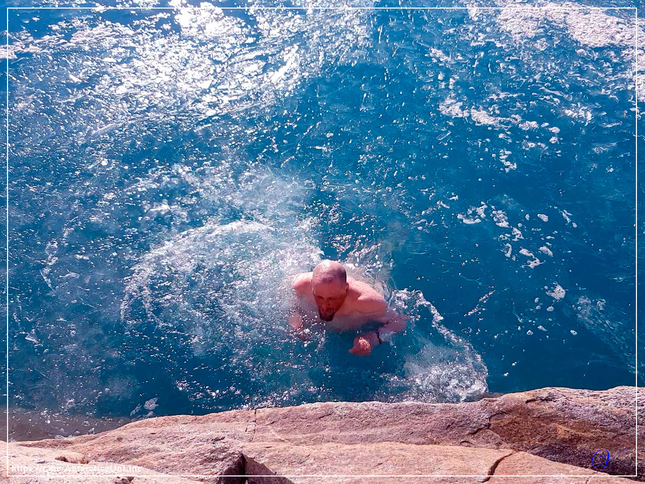Надо признать нам очень повезло с погодой в тот день. После полудня начало припекать солнце, а по камням снова побежали ручьи. Да и вода в озерах выглядела как-то совсем по летнему голубой и такой привлекательной. В итоге мы немного искупались. Я тут сокрушался об окончании лета и конце «бархатного сезона», но как оказалось лето в Антарктиде заканчивается тогда, когда уже невозможно проломить лёд в озере. А тут пара крупных камней со скалы и снова настал «Бархатный сезон».