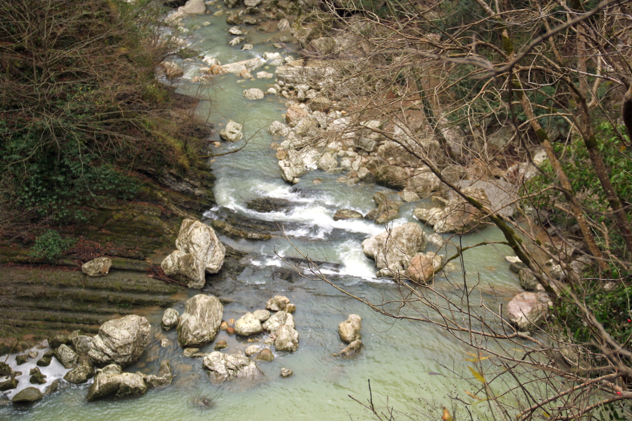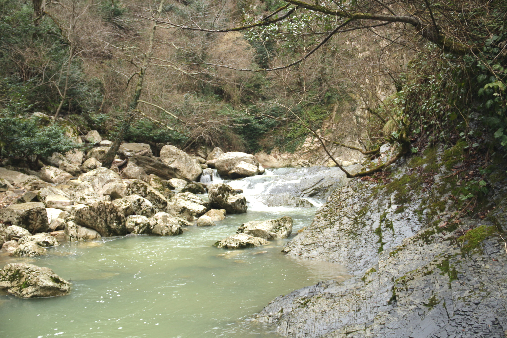 Выполнил поход по Агурскому ущелью в пасмурную, слабодождливую погоду (деваться некуда - льет почти каждый день, а время не ждет). Но честно прошел, прополз, прокорячился через все ущелье, перепрыгал на другой берег Агуры по валунам, прошел второй водопад и поднялся по дикой круче до Орлиных скал, откуда спустился в Мацесту.