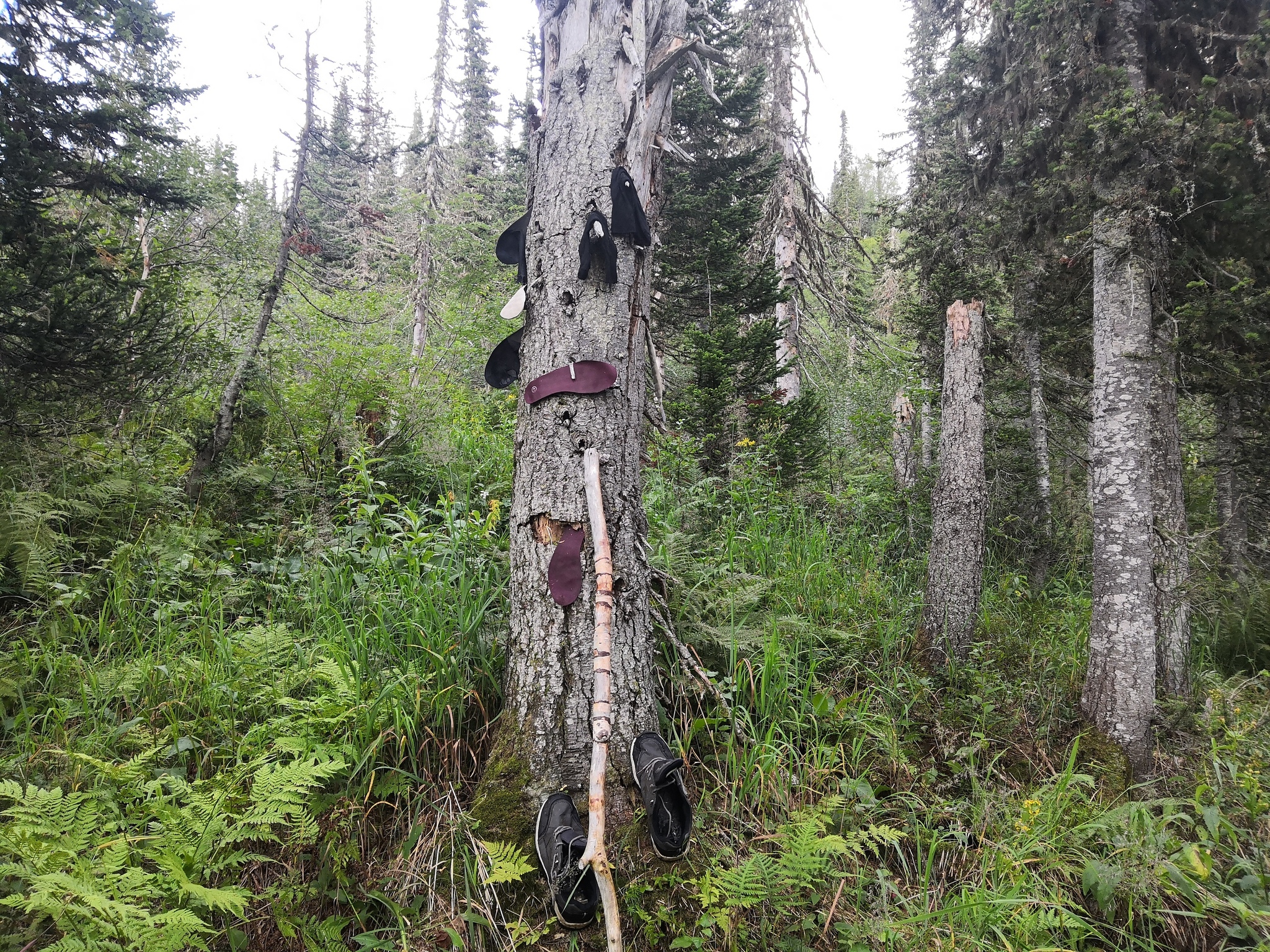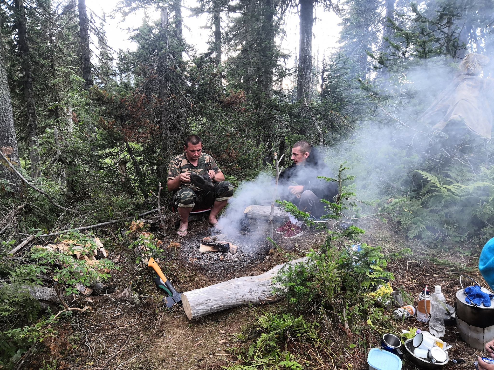 Саша, заколебавшийся спать на сдутой синей тряпке, пошёл срезать папоротники под палатку, что повторили и мы. Расставили, срубили сушнину, с ручья набрали воду и, подогрев, пошли мыться. Свежие, переодевшиеся, ели борщ, я вечно оглядывалась, смотрела на реакцию Хельги, которая поглядывала в сторону тропы очень настороженно, мне все ещё было какатно!
