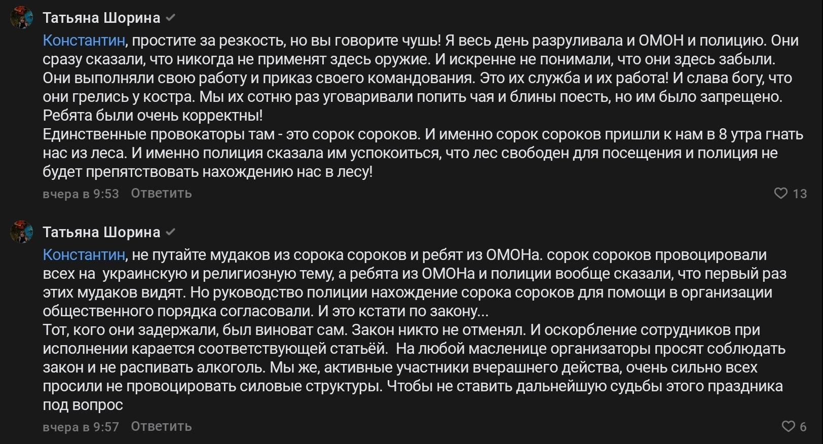 Понимаете, если некоторые люди стоят в оцеплении вместе с ОМОН, если им сверху согласовали присутствие, если им позволяется провоцировать на политические темы людей, пришедших в надежде на праздник, а также ломать то, что построили организаторы, то на мой взгляд они действуют совместно. ОМОН-овцы, возможно, сами не в большом восторге, но у них, насколько понимаю, был приказ.