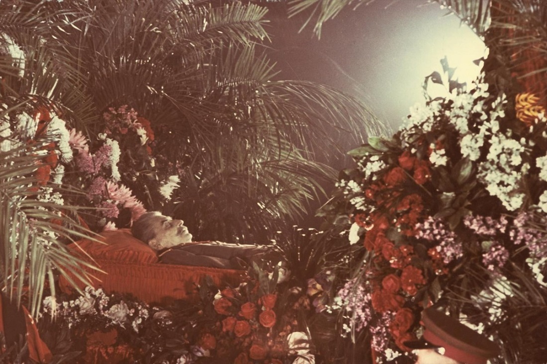 Днём 6 марта тело Сталина было выставлено для прощания в Колонном зале Дома Союзов на Охотном ряду. Здесь же, кстати, в январе 1924-го проходило прощание с Лениным, а потом "гостями" зала стали другие советские руководители. Вождя положили в открытый гроб, который стоял на высоком постаменте, в окружении яркой зелени и цветов.