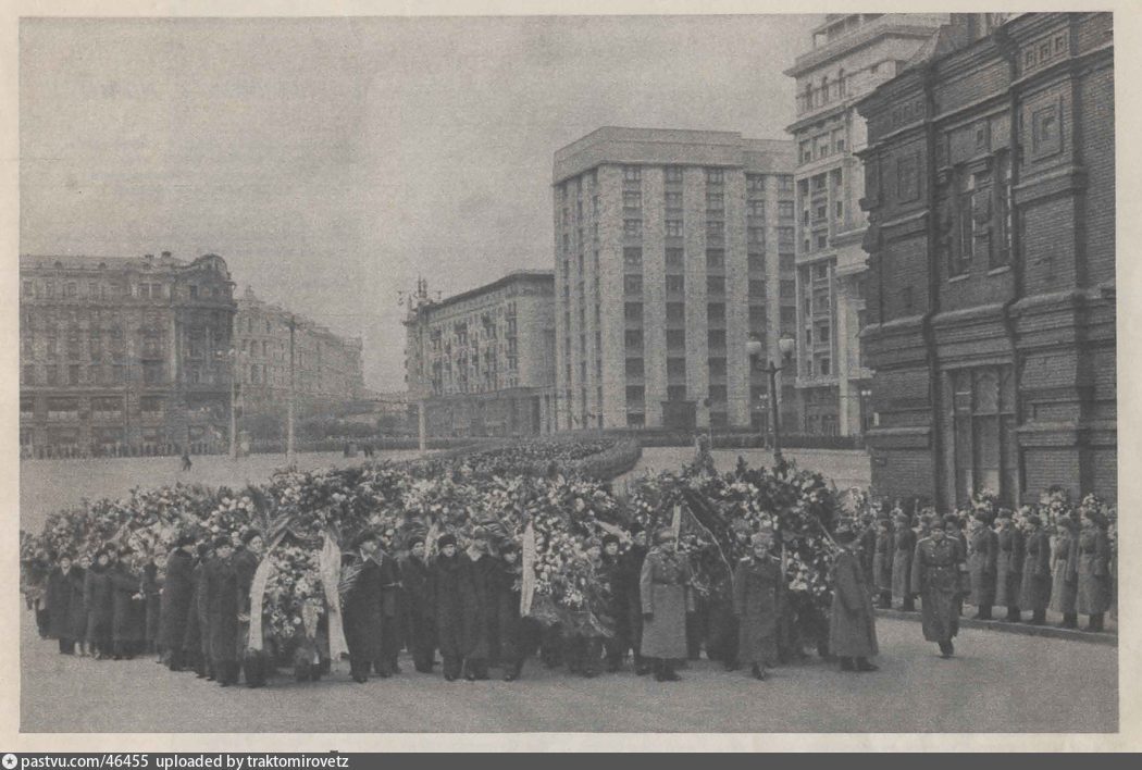 Манежная площадь, фото из журнала "Огонёк". Процессия двигалась к Красной площади под звуки Траурного марша Шопена. Путь к Мавзолею занял 22 минуты.