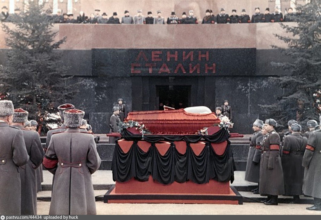 Прощание в Колонном зале длилось три дня и три ночи. Сами похороны Сталина начались 9 марта в 10:15, когда Маленков, Берия, Молотов, Ворошилов, Хрущёв, Булганин, Каганович и Микоян с гробом вождя вышли из Дома Союзов. Гроб был установлен на орудийный лафет, и процессия двинулась к Мавзолею. На Красной площади уже ждали построенные красноармейцы (4400 человек) и трудящиеся (12 000 человек). Кстати, организатором похорон Сталина был не кто иной, как Никита Хрущёв.