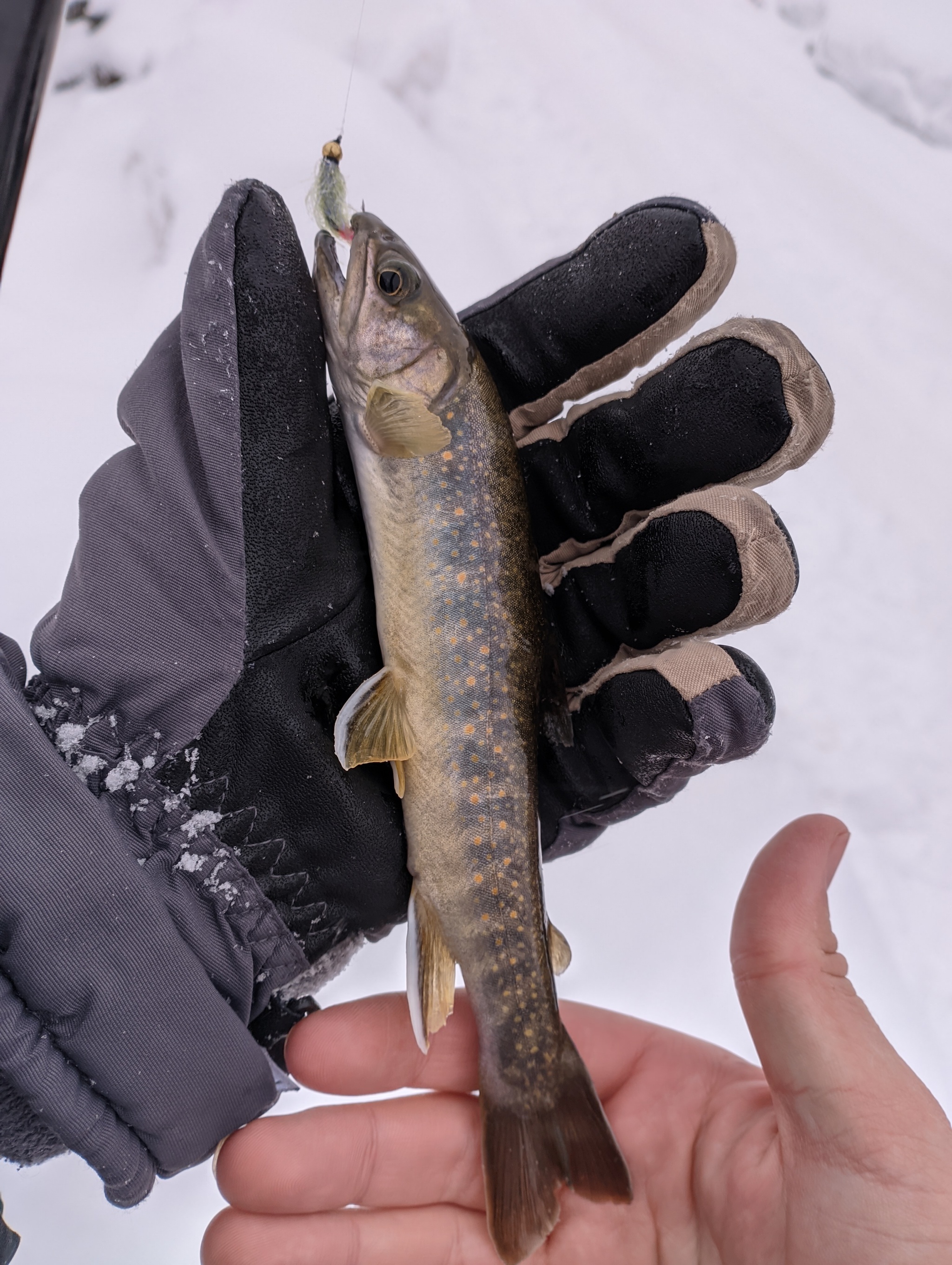 Пока Глеб собирает спиннинг, я уже разложился и пускаю свою мушку вниз по течению. Наблюдаю, как вокруг неё крутятся мелкие рыбёшки, пытаясь заглотить несоразмерную их ртам приманку. А значит, подкаменки в этой яме стоят и вполне активны. К этому моменту Глеб собрал спиннинг и уже сгоняет меня с места, притом вполне оправданно: мне с четырёхметровой удочкой гораздо проще ловить на разнообразных по береговому рельефу местах, чем ему, и поэтому могу ловить и в другом месте. Да и он к тому моменту ещё не обрыбился, в отличие от меня. Я принял волевое решение идти на разведку ниже по течению, мало ли, есть ещё ямы с рыбами. Во время обхода ямы, на которой мы остановились, моё внимание привлекло нечто особенное. Огромный. Рыбий хвост. Два. Сомнений не было: это были рыбины, ну, как минимум одна. Чёткие движения тела, характерные для речной рыбы и явные черты хвоста не давали мне обмануться: на этой яме стояла мальма. Я кричу ребятам о своей находке и все мы приступаем к целенаправленной ловли этой красивой рыбки. Мальма по большей части крупнее подкаменки, более разборчива и намного более интересный противник. Минут через пятнадцать от начала вакханалии, связанной с моей находкой, после искуссных проводок и подбора приманки, после нескольких атак предположительно интересующей на рыбины, Глеб подсекает прекрасную, крупную для этого времени года и места мальму.