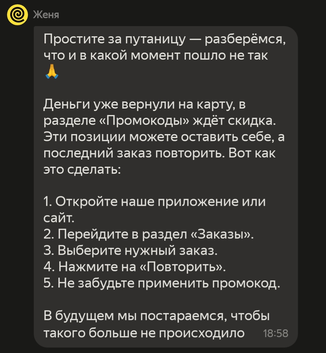 И вот, представьте себе, заказываю я шаурму в яндекс.еде, а привозят не то! Расстройство, усугубляемое бурчащим желудком и хныкающей женщиной заставляет меня писать в поддержку, а там: