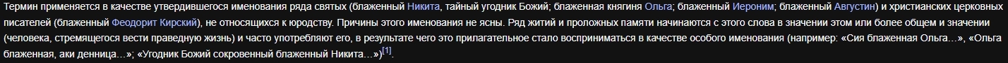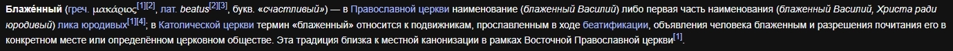 Тут мы узнаём, что блаженный это второе название юродивого в православии. И что-то тут ещё про католическую церковь, но это сейчас не актуально и я это опускаю. Кто такие юродивые уже известно. Но у слова "блаженный" есть ещё несколько значений:
