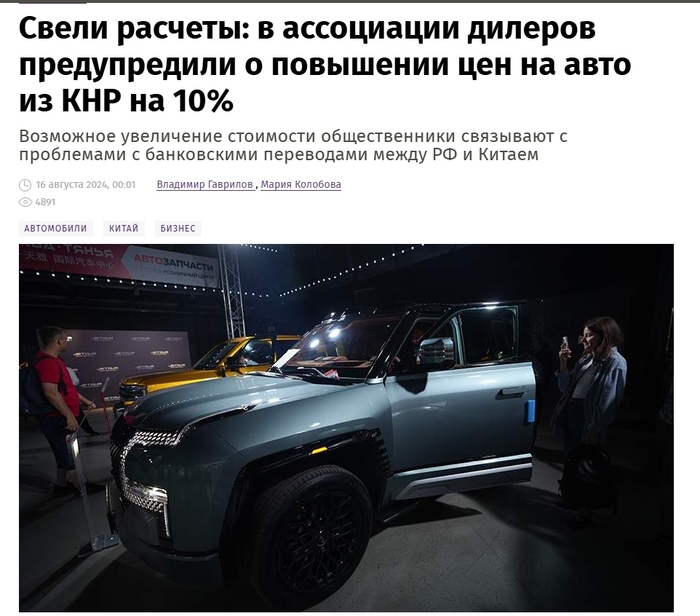 Автодилеры с сентября вынуждены будут повысить цены на китайские машины на 10% из-за проблем с банковскими расчетами между РФ и КНР. Об этом «Известиям» рассказали в ассоциации «Российские автомобильные дилеры». Переводы между РФ и КНР идут два месяца, а некоторые возвращаются обратно, что резко увеличивает себестоимость доставки. В отрасли утверждают, что оборот средств тормозится, и с учетом этого продавцы автомобилей уже лишились примерно 8% вложений. Участники рынка предупреждают, что если проблема с расчетами сохранится, то на фоне повышения утилизационного сбора в IV квартале стоит ожидать еще одного изменения цен.