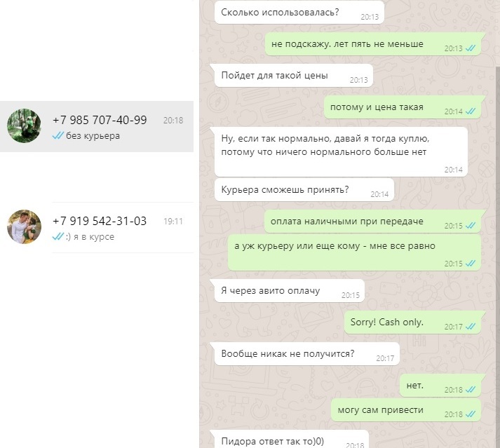 8 sh5273 "Покупатель" с авито 5 лет назад Второй такой же, но менее разговорчивый. В объявлении написано "только наличные!" [моё] Авито Развод на деньги Ещё 0