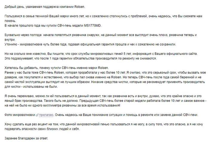 Если в кратце, то микроволновая печь начала ржаветь после полугода бережного использования.